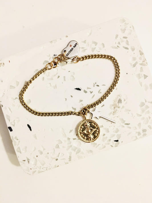 Gold Evil Eye Coin Bracelet and Magic Wand Charm