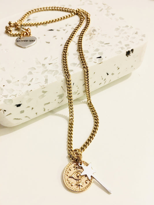 Gold Evil Eye Coin Necklace and Magic Wand Charm